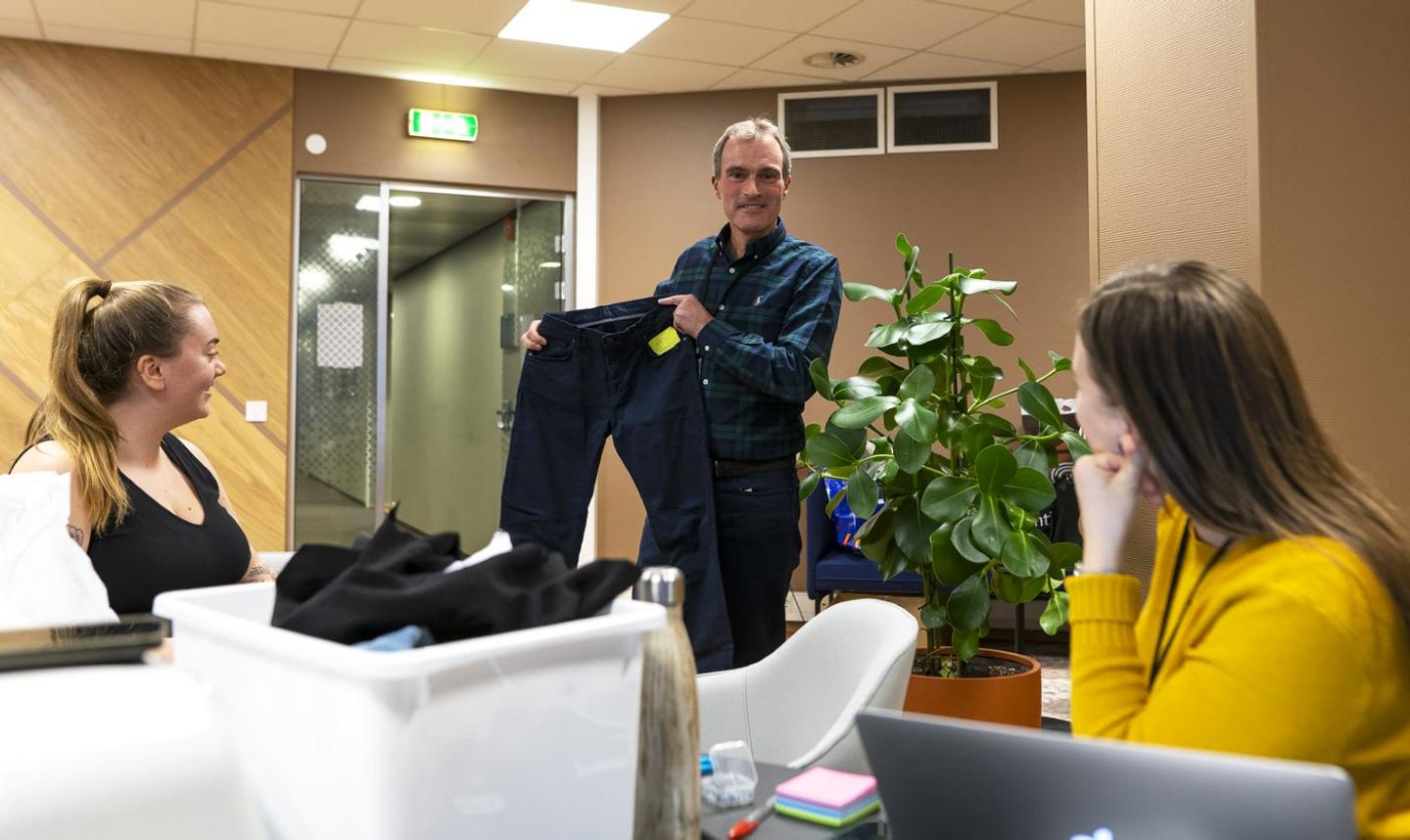 Fornøyd Fremtinder, Neil Myers, har fått reparert et av sine favorittplagg. Foto: Fremtind